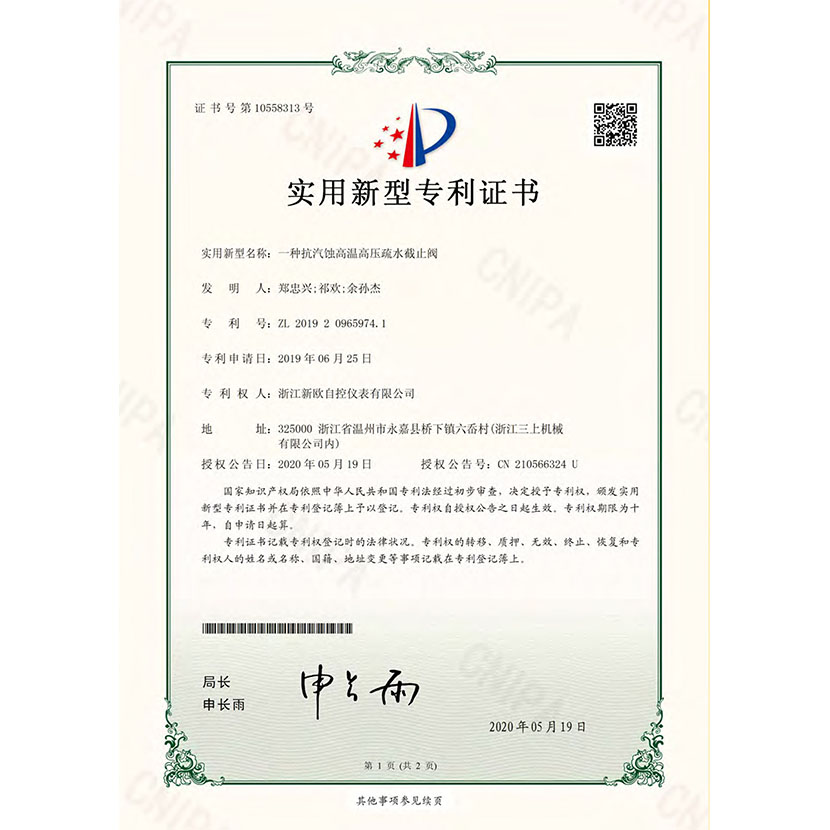 一種抗汽蝕高溫高壓疏水截止閥 專利證書